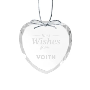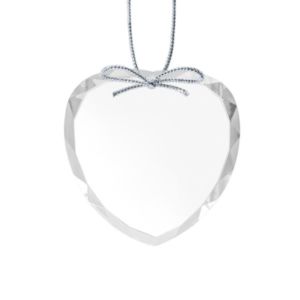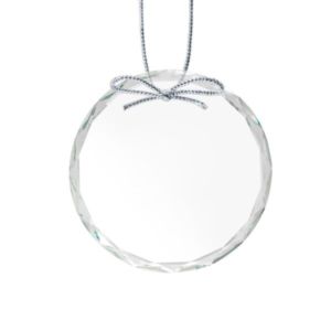 Optical crystal round ornament with silver ribbon.