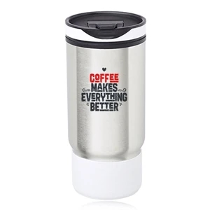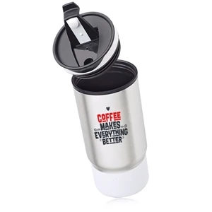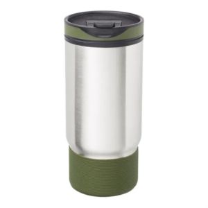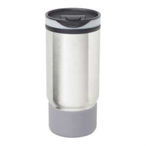 17 oz. ribbed stainless steel travel mug with plastic interior and flip closure lid.