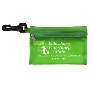 7 piece first aid kit with carabiner, bandages, towelettes and a first aid guide.