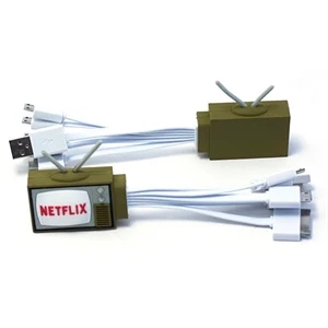 Plastic, PVC 5-in-1 charging cable for various devices with a custom sleeve.