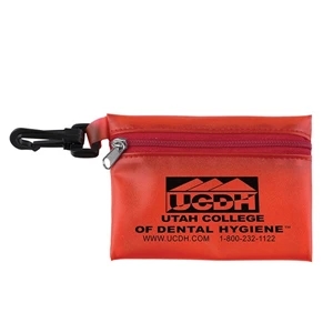 8 piece first aid kit with zippered pouch, carabiner, bandages, antiseptic towelette, antibiotic ointment, moist towelettes, etc.