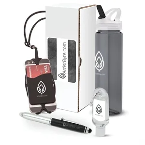 4-piece gift set with 25 oz. PET water bottle, phone/card holder, 3-in-1 ballpoint pen and 1 oz. hand sanitizer.