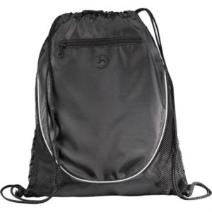 17" x 14" drawstring bag with zippered front pocket and earbud port.