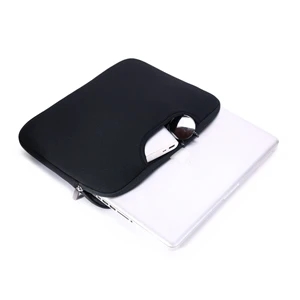 40cm x 29cm x 2.5cm neoprene laptop sleeve with double zippered closure and carrying handle.
