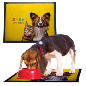 20" x 16" woven polyester pet mat with rubber backing and customization.