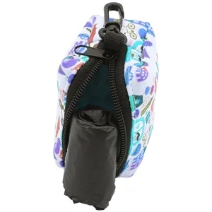 Pet poop waste bag dispenser with metal carabiner.