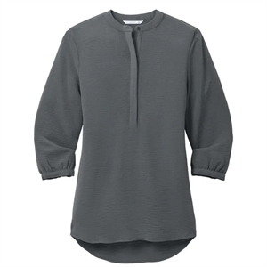 Ladies' tunic with a banded collar, placket, buttons, 3/4 sleeves, cuffs, and rounded drop tail hem.