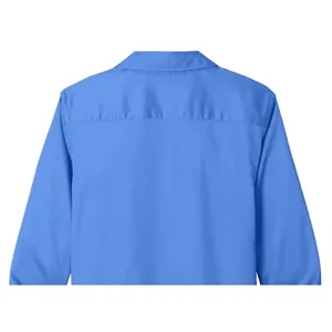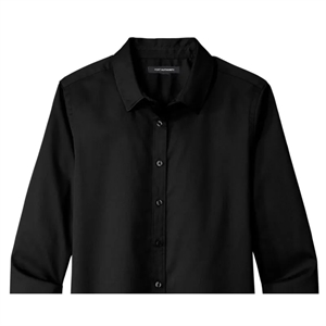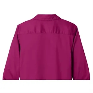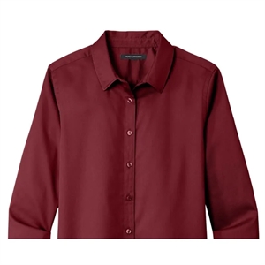 Ladies' shirt with long sleeves, wrinkle resistance, stain-release, collar, buttons, cuffs, and back yoke.