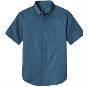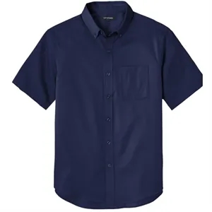 Shirt with wrinkle resistance, stain release, button-down collar, chest pocket, and back yoke.