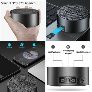 3.3" x 3.3" x 1.45" round plastic wireless Bluetooth speaker.