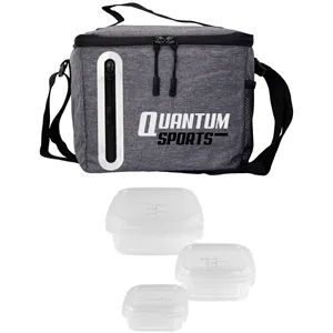 9" x 6.5" x 7.5" cooler bag with square portion control containers.