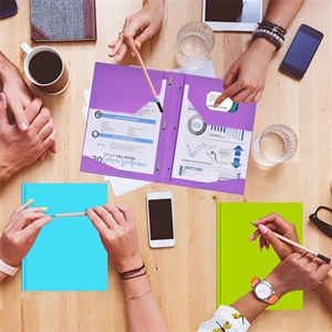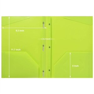 11.7" x 9.4" plastic folios with three-hole prong paper attachments and slip pockets.