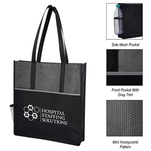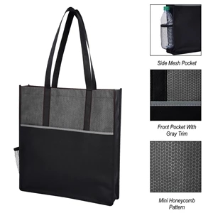 15" x 16" x 3" Promenade 80GSM non-woven polypropylene tote bag with front and side mesh pockets.