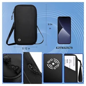 RFID-blocking passport wallet with slots for passports, cards, and phone storage; stylish and secure. Rush service is available.