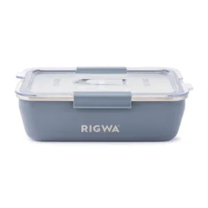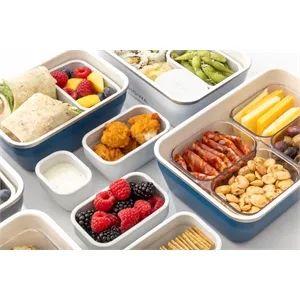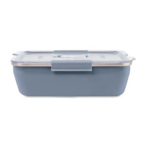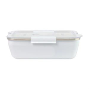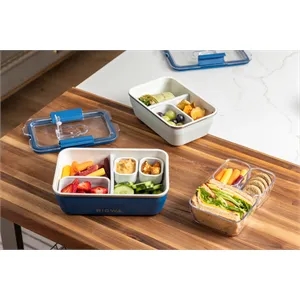 9" x 6" bento box with 46 oz. capacity and made with double-wall stainless steel and a clear Tritan lid.