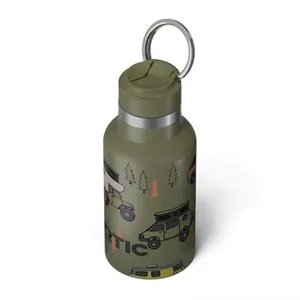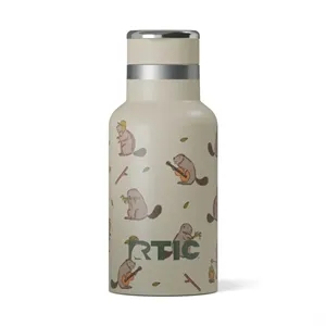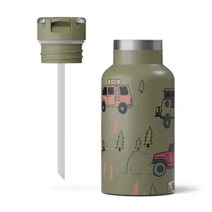 12-ounce stainless steel water bottle with a straw lid, ceramic lining, insulation, handle, and silicone coaster.