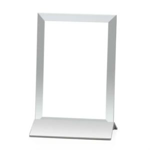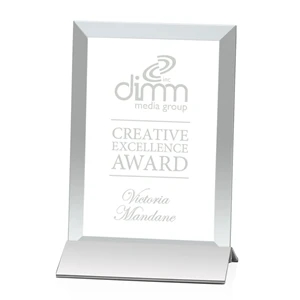 An elegant pane of jade crystal is beveled, then mounted in a silver powder coated aluminum base.