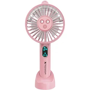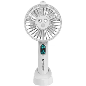 Rechargeable handheld fan with mist spray function.