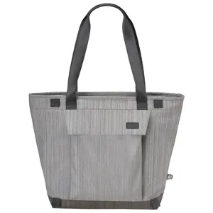 Durable 300D RPET tote with 15.5" laptop sleeve, large flap pocket, two-tone design, strap loops, 27" wide straps, secure zipper