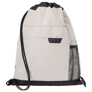 Durable 250D RPET ripstop bag with a modern two-tone design, mesh pocket, drawstring closure & back zip storage.