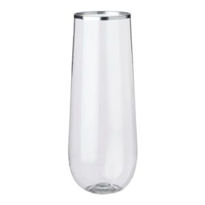 9 oz. plastic stemless flute glass with silver rim.