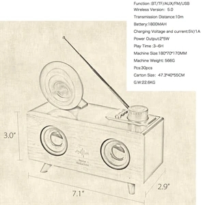 7" x 2.76" x 6.69" plastic retro wood-look Bluetooth wireless speaker.