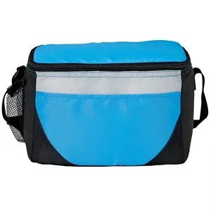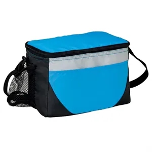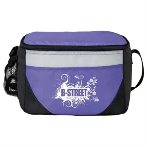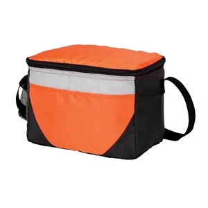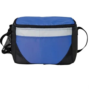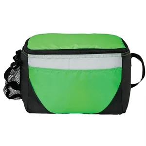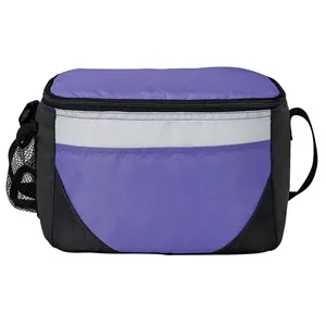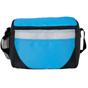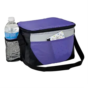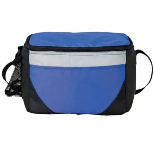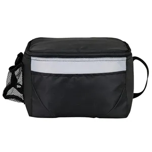 Lunch bag and cooler with 6-can zipper compartment, side mesh pocket, front pocket, and adjustable carrying strap.