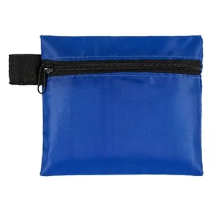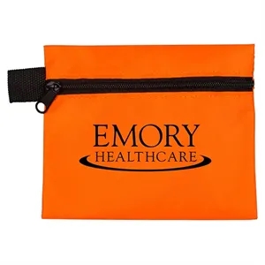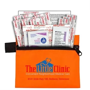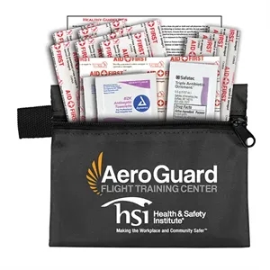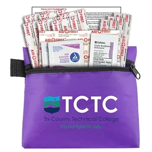 14 piece first aid kit with a zippered pouch, bandages, antibiotic ointment, antiseptic towelettes and a first aid guide.