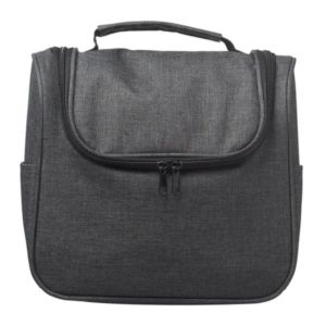 Two-toned toiletry bag made of 600 denier PVC with zippered main compartment, two pockets on sides, etc.