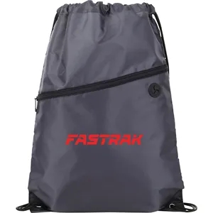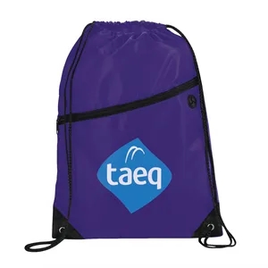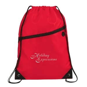 18" x 13" drawstring bag with zippered front pocket and earbud port.