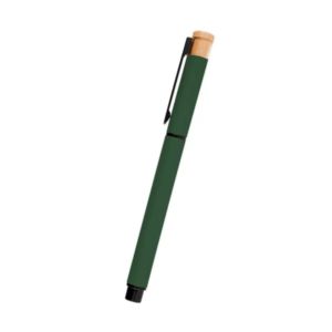 Recycled aluminum gel pen with removable cap and bamboo accent.