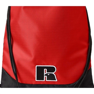 Drawstring bag with a front patch, thick rope cinch, and zipper pocket.