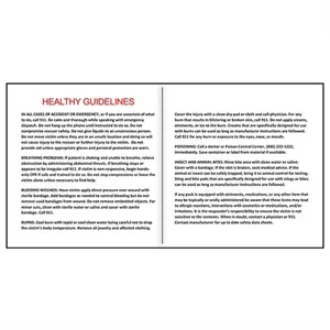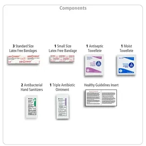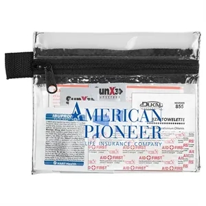 10 piece first aid kit with zippered pouch, bandages, towelettes, hand sanitizer packets, ointment and healthy guidelines insert.