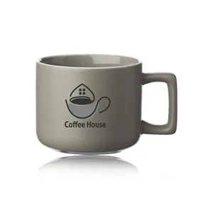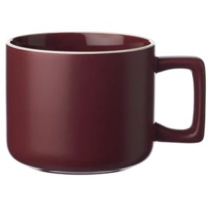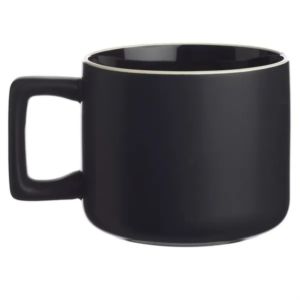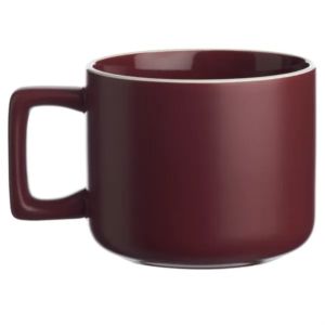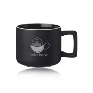 11 oz. ceramic mugs with square handle design, matte exterior, glossy interior and white rim.