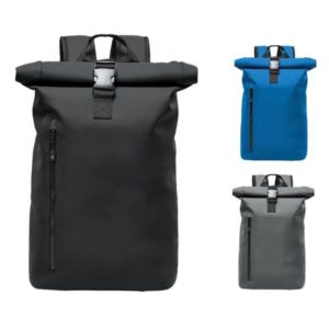 Backpack with a waterproof design, roll-top closure, adjustable straps, external zippered pocket, carry handle and more.