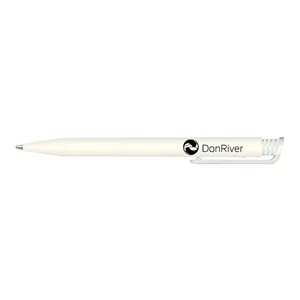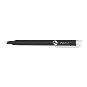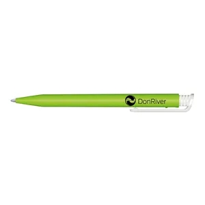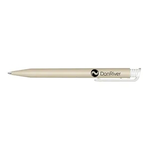 Plunger action ballpoint pen with matte barrel, pocket clip; made of renewable materials.