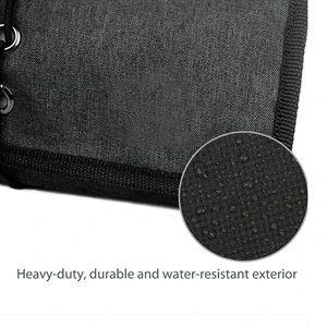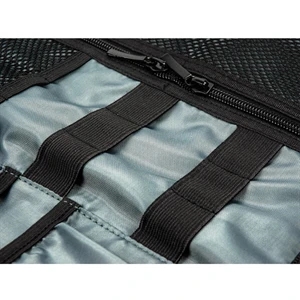 18" x 19" x 16.5" tech organizer with strap cord holders and assorted net and zippered compartments.