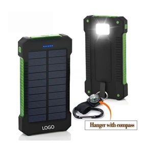 5 1/2" x 3 1/7" x 7/9" ABS and PC solar powered 8000mAh powerbank with LED flashlight, carabiner clip and compass.