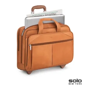 6.5" x 12.5" x 16.5" Solo® leather rolling trolley case with padded laptop compartment, and extendable 38.5" handle.