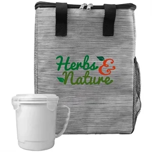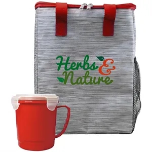 Gift set with an insulated cooler tote bag and soup mug with lid and handle.