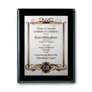 Digitally reproduce your artwork in full color on a silver plate, mounted to our ebony piano finished wood plaque
