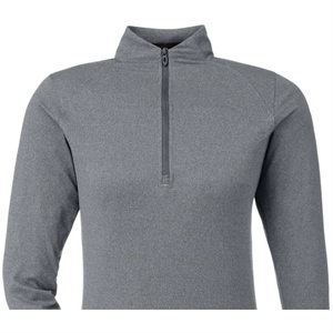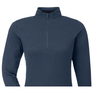 Ladies' sweatshirt with a quarter-zip, 40+ UV protection, collar, zipper, neck tape, back vent, reflective tape, and side vents.