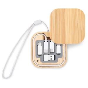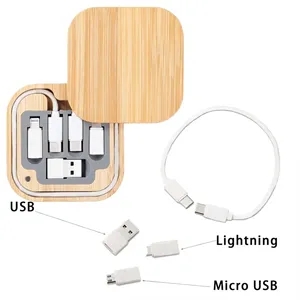 3-in-1 fast charging cable with USB-C, Lightning, and Micro USB connectors in a durable bamboo case - compact, universal.