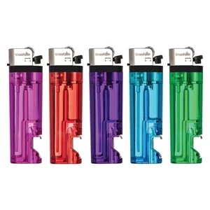 Lighter with a standard flame, gloss plastic finish and a built-in bottle opener.