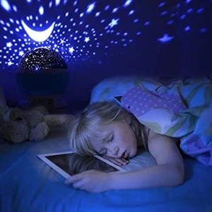 4.7" x 4.7" x 5.3" plastic desktop star projector with 360 movement, four LEDs and eight colors.