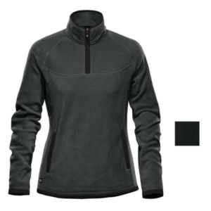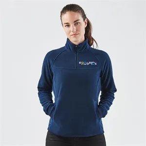 Women's fleece top with a 1/4 zip high collar, a kanga pocket with brushed tricot, audio sleeve and a cuff and hem.