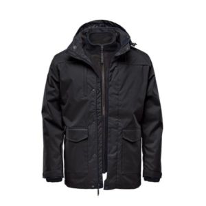 3-in-1 men's parka with an outer shell, anti-pill fleece liner, stowable hood, reflective trim, zippered chest pockets and more.