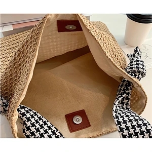13.78" x 0.79" x 12.99" straw and pongee beach bag with knotted handles.
