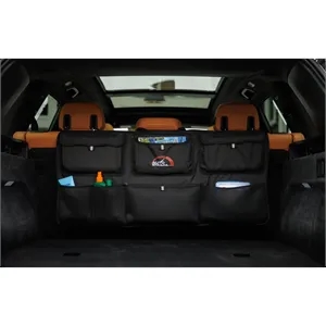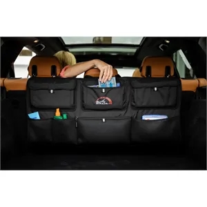 Backseat organizer with pockets and multiple compartments.