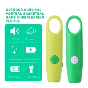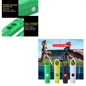 3.94" x 0.79" x 0.79" electronic 110 dB whistle with two tones, batteries and wrist lanyard.